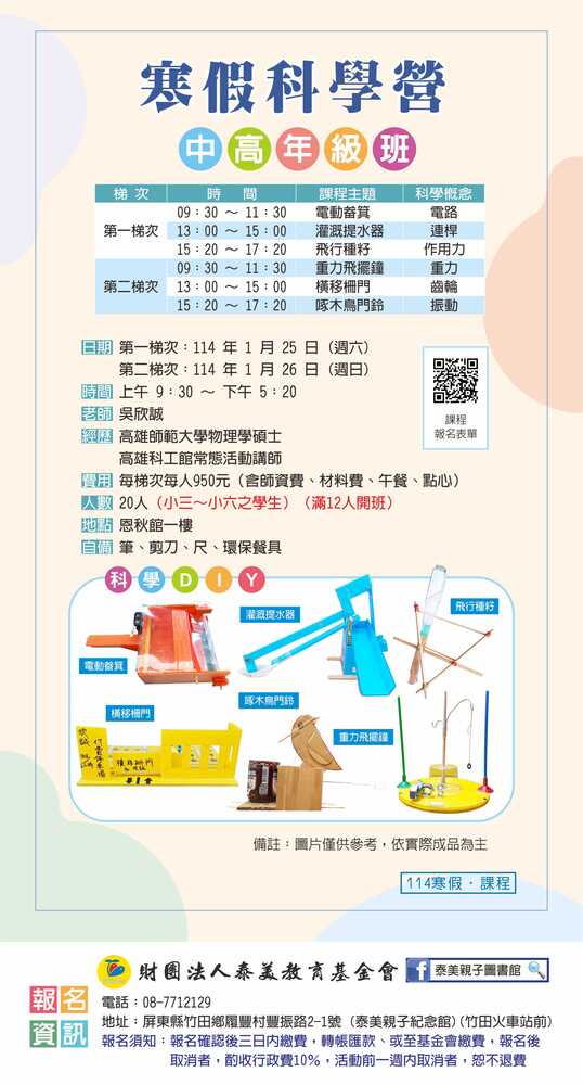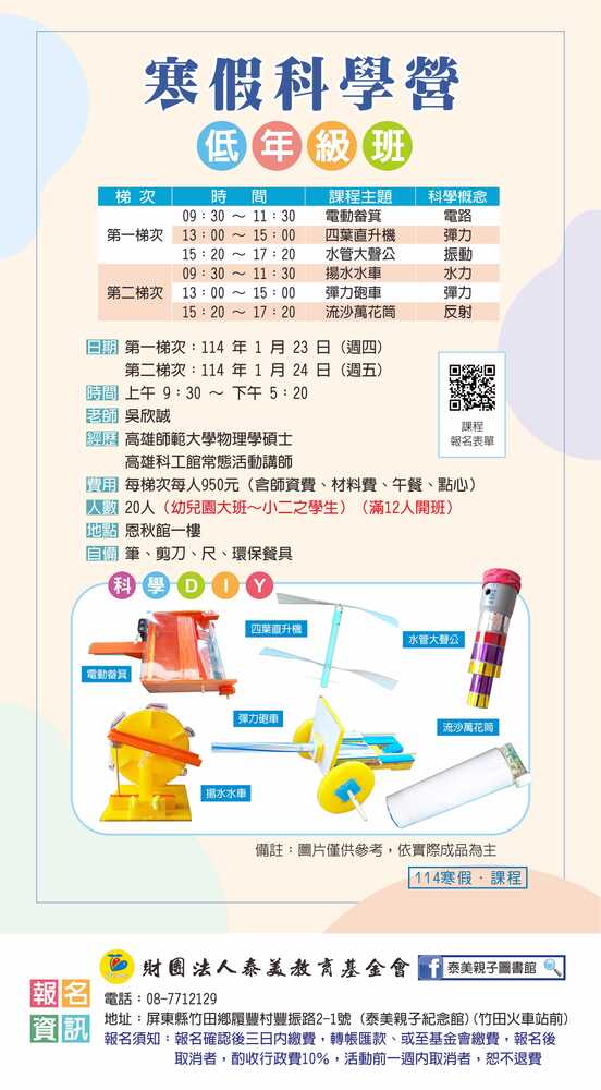 泰美寒假課程【寒假科學營~低年級班、中高年級班】,歡迎大家踴躍報名參加!!