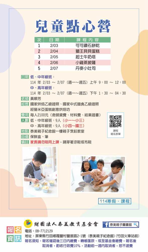 泰美寒假課程【兒童點心營~低中年級班、中高年級班】,歡迎大家踴躍報名參加!!