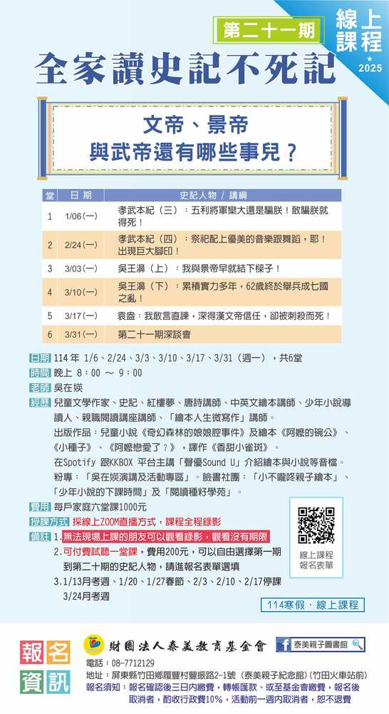 泰美線上課程【全家讀史記不死記】第二十一期直播課程】,歡迎大家踴躍報名參加!!